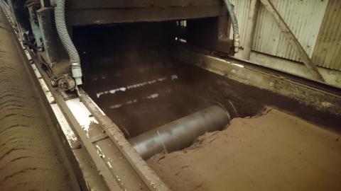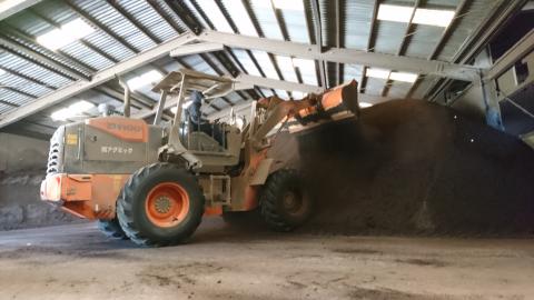 撹拌機堆肥舎から撹拌機のラインに移し、ロータリー式撹拌機で堆肥を粉砕・乾燥させます。 |